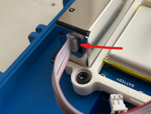 Het blijkt dat met het indrukken van het knopje (meer dan 10 seconden) het blauwe lampje niet uitgaat. Dan kan het volgende gedaan worden. Haal de stekker uit het stopcontact. Maak de batterij los door het stekkertje los te maken. Zie foto.